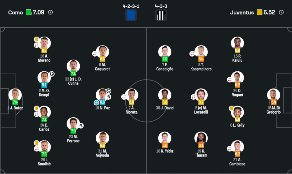 นิโก ปาซ (คะแนน 8.6) กองกลางวัยหนุ่มของโคโมระเบิดฟอร์มเทพ ยิง 1 แอสซิสต์ 1 มีส่วนร่วมกับเกมรุกแทบทุกจังหวะ การพาบอลและเปิดบอลแม่นยำ สร้างความปั่นป่วนให้แนวรับยูเวนตุสตลอดทั้งเกม
