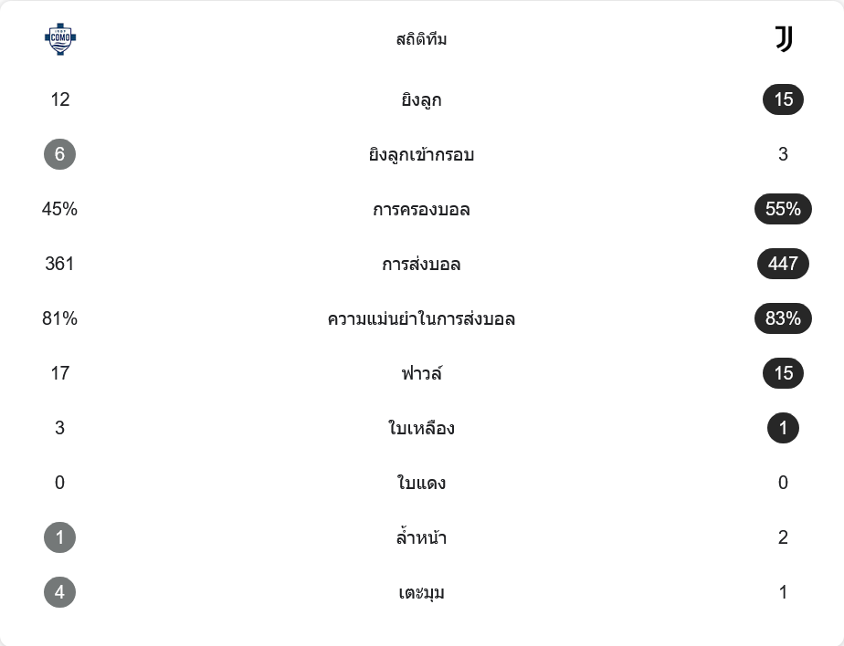 ตลอดเกม ยูเวนตุสครองบอลมากกว่า 55% เทียบกับโคโม 45% มีจำนวนการส่งบอล 447 ต่อ 361 ความแม่นยำ 83% ต่อ 81% ยิงทั้งหมด 15 ครั้ง แต่เข้ากรอบเพียง 3 ขณะที่เจ้าถิ่นยิง 12 ครั้ง เข้ากรอบถึง 6 ครั้ง การทำฟาวล์ค่อนข้างสูสี 17 ต่อ 15 โคโมได้เตะมุมมากกว่า 4 ครั้งต่อ 1 ใบเหลืองเจ้าบ้าน 3 ใบ ทีมเยือน 1 ใบ ไม่มีใบแดง