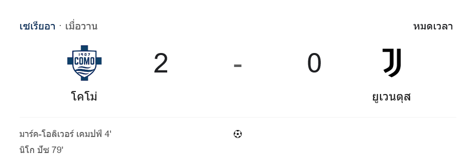 ศึก กัลโช่ เซเรียอา ค่ำคืนสุดดราม่า กลายเป็นเกมที่แฟนบอลทั้งลีกต้องพูดถึงเมื่อ โคโม ทีมกลางตารางสร้างเซอร์ไพรส์เปิดบ้านดับเครื่องร้อน ยูเวนตุส ไปแบบจุกๆ 2-0 จากผลงานสุดโหดของ นิโก ปาซ ที่ยิง 1 จ่าย 1 พาทีมคว้าชัยสำคัญ ท่ามกลางเสียงเชียร์ลั่นสนาม ด้าน บ้านกีฬา เกาะติด ผลบอลสด แบบเรียลไทม์มาเสิร์ฟครบทุกจังหวะมันส์