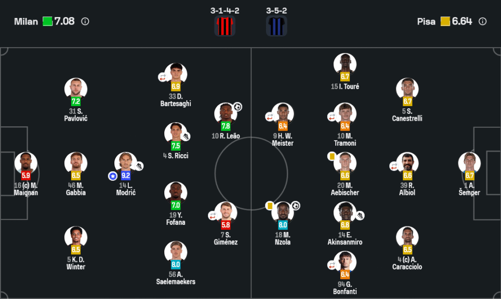 Maignan (GK), Pavlović, Gabbia, Winter, Ricci, Modrić, Fofana, Saelemaekers, Bartesaghi, Leão, Giménez