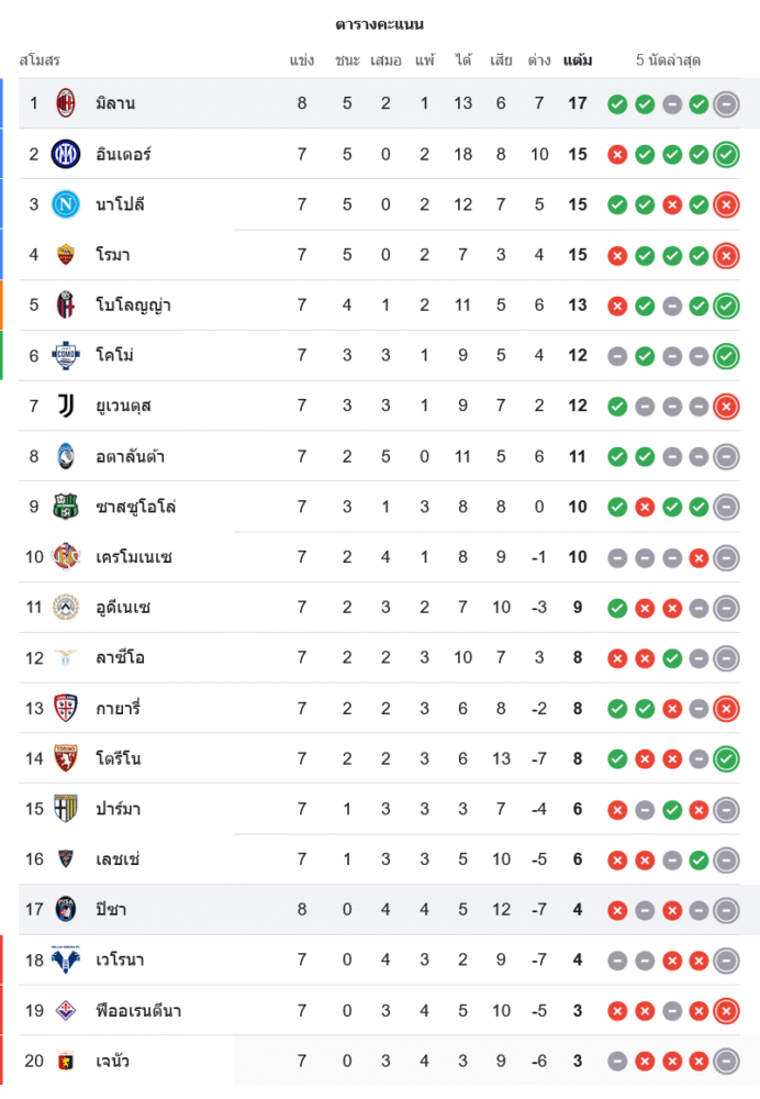 ผลเสมอในเกมนี้ทำให้ เอซี มิลาน เก็บเพิ่มเป็น 17 คะแนน รั้งตำแหน่งจ่าฝูง เซเรียอา ต่อไป ส่วน ปิซ่า แม้จะยังไม่ชนะใคร แต่แต้มนี้ก็สำคัญมากเพราะทำให้ขยับขึ้นเป็น 4 คะแนน ยังมีลุ้นหนีโซนแดงในช่วงต่อไป
