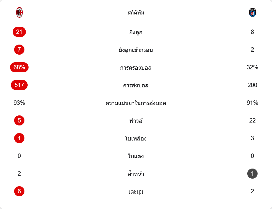 เกมนี้มิลานครองบอลมากกว่าอย่างชัดเจน 68% เทียบกับปิซ่า 32% มีโอกาสยิงถึง 21 ครั้ง เข้ากรอบ 7 ครั้ง ในขณะที่ปิซ่ายิงเพียง 8 ครั้งเข้ากรอบ 2 ครั้ง การส่งบอลของมิลานมากถึง 517 ครั้ง ขณะที่ปิซ่ามีเพียง 200 ครั้ง ความแม่นยำของทั้งสองทีมอยู่ในระดับสูงเกิน 90% ฝั่งปิซ่าทำฟาวล์ถึง 22 ครั้ง รับใบเหลือง 3 ใบ ส่วนมิลานฟาวล์เพียง 5 ครั้ง รับใบเหลือง 1 ใบ