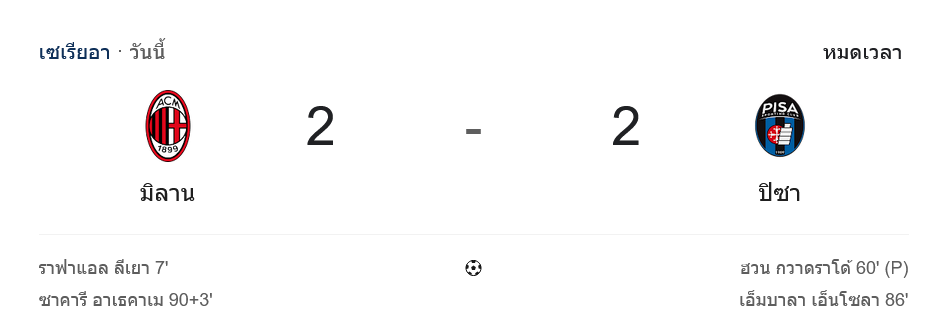 ศึก เซเรียอา คืนนี้ที่ซาน ซิโร่ ปรากฏว่า เอซี มิลาน ต้องออกแรงเหนื่อยกว่าจะไล่ตีเสมอ ปิซ่า แบบดราม่าท้ายเกม 2-2 หลังโดนนำในช่วง 5 นาทีสุดท้าย ก่อนที่ ลูก้า โมดริช จะกลายเป็นพระเอกจ่ายบอลเด็ดให้เพื่อนช่วยทีมคว้า 1 คะแนนสำคัญ เก็บแต้มรั้งจ่าฝูงต่อแบบหวุดหวิด เรียกเสียงฮือฮาไปทั่วโลก ผลบอลสด คู่นี้จัดว่าเดือดเกินคาด