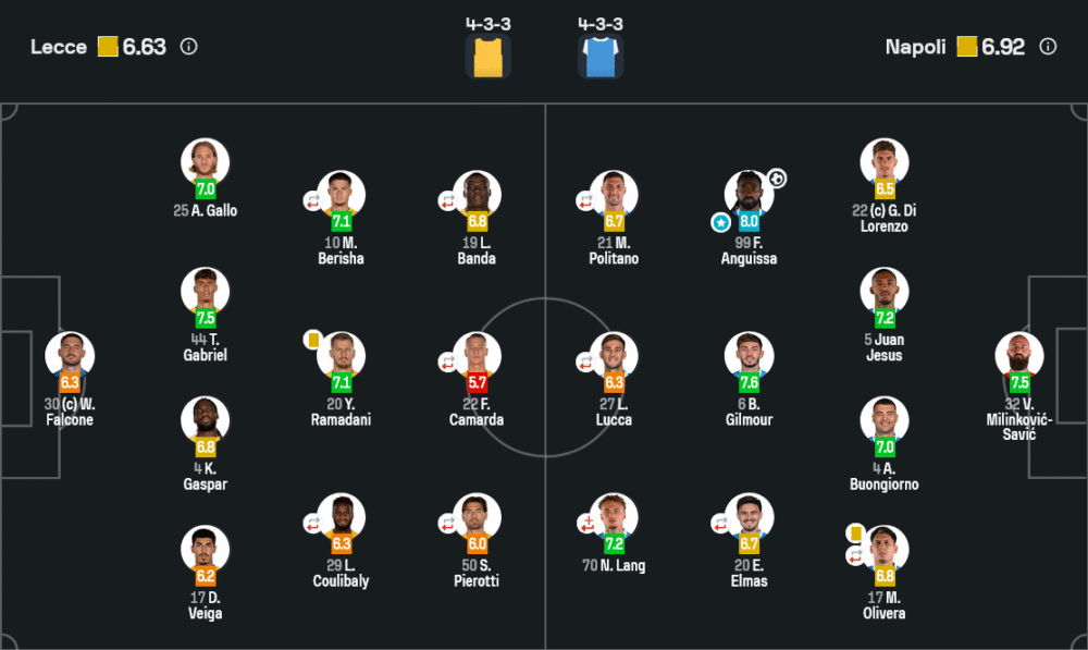 เปลี่ยนตัว: 46′ เตเต โมเรนเต้ ⬆️ (แทน ปิเอโรตตี 6.8) / 70′ นิโกล่า สตูลิช ⬆️ (แทน คามาร์ดา 6.6) / 77′ ยูสเซฟ มาเลห์ ⬆️ (แทน คูลิบาลี 6.9) / 77′ บัลธาซาร์ ปิแร์เรต์ ⬆️ (แทน เบริชา 6.8)