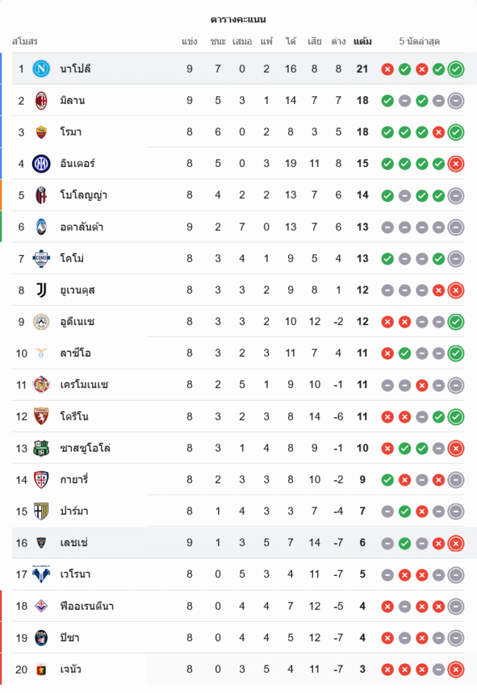 สามแต้มพานาโปลีเก็บเพิ่มเป็น 21 คะแนนจาก 9 นัด (ชนะ 7 แพ้ 2) ยึดจ่าฝูงต่อด้วยฟอร์มคงเส้นคงวา ส่วนเลชเช่อยู่ อันดับ 16 มี 6 แต้มจาก 9 นัด ต้องเร่งเครื่องหนีโซนแดงเพราะระยะห่างไม่ปลอดภัย