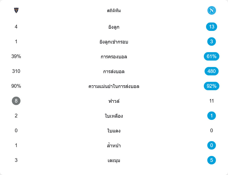 ตัวเลขตอกย้ำความเหนือกว่าของจ่าฝูง นาโปลีครองบอลถึง 61% จ่ายบอล 480 ครั้ง ความแม่นยำ 92% กดส่องทั้งสิ้น 13 ครั้ง เข้ากรอบ 3 ส่วนเลชเช่ครอง 39% ยิง 4 เข้ากรอบ 1 โอกาสดีที่สุดคือจุดโทษนาที 54 ที่พลาดไป ฟาวล์ค่อนข้างหนา 8 ต่อ 11 ใบเหลืองเจ้าถิ่น 2 ทีมเยือน 1 เตะมุม 3 ต่อ 5 เกมเดินหน้าและจังหวะสำคัญเป็นของอัซซูราแทบทั้งหมด
