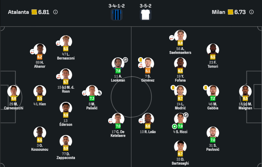 จากมุมมองเชิง วิเคราะห์บอล เกมนี้อตาลันต้าเน้นการครองบอลและการผ่านบอลเร็วระยะสั้น ใช้แผน 3-4-1-2 เปิดพื้นที่ริมเส้นให้ลุคแมนและเดอ เคเตลาเร่ทำเกมรุก ส่วนมิลานของอัลเลกรีเล่น 3-5-2 เน้นรับแน่นสวนกลับเร็ว โดยใช้ความคล่องของริคคี่และเลเอา เกมรับของมิลานแม้จะเหนียวแน่นแต่ยังมีช่องโหว่ทางขวา ส่วนอตาลันต้าแม้บุกมากแต่ขาดความคมในจังหวะสุดท้าย ถ้ามีตัวจบสกอร์เฉียบกว่านี้อาจคว้า 3 แต้มได้เลย