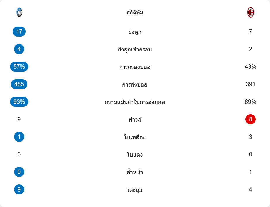 อตาลันต้าครองบอลเหนือกว่าที่ 57% มีโอกาสยิงมากถึง 17 ครั้ง เข้ากรอบ 4 ขณะที่มิลานยิงเพียง 7 ครั้งเข้ากรอบ 2 ครั้ง อตาลันต้ามีอัตราการส่งบอลสำเร็จ 93% จาก 485 ครั้ง สูงกว่ามิลานที่ทำได้ 89% จาก 391 ครั้ง เกมนี้มีฟาวล์รวม 17 ครั้ง ใบเหลืองฝั่งอตาลันต้า 1 ใบ มิลาน 3 ใบ และไม่มีใบแดง เตะมุมรวม 13 ครั้ง เป็นอีกเกมที่สถิติชี้ว่าเจ้าบ้านเหนือกว่าชัดเจน