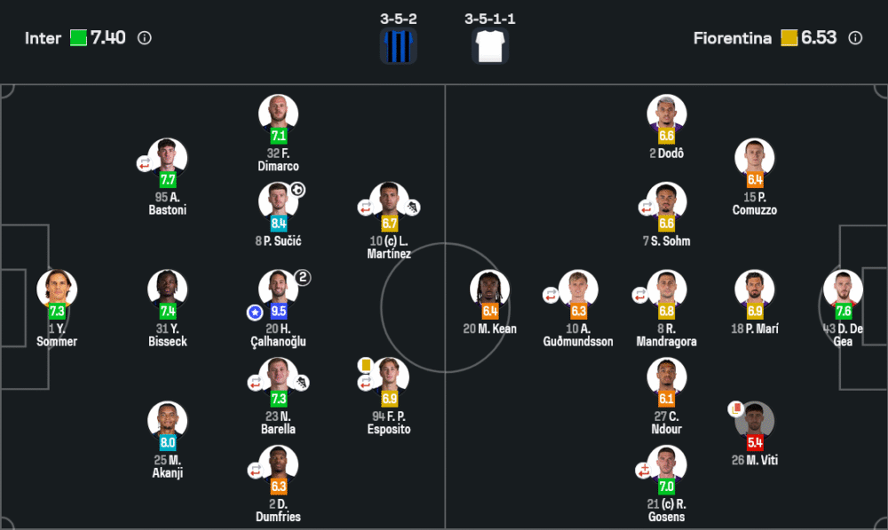 กองกลาง: เดนเซล ดุมฟรีส์ (6.3), นิโคโล บาเรลล่า (7.3), ฮาคาน คัลฮาโนกลู (9.5), เปตาร์ ซูชิช (8.4), เฟเดริโก ดิมาร์โก (7.1)