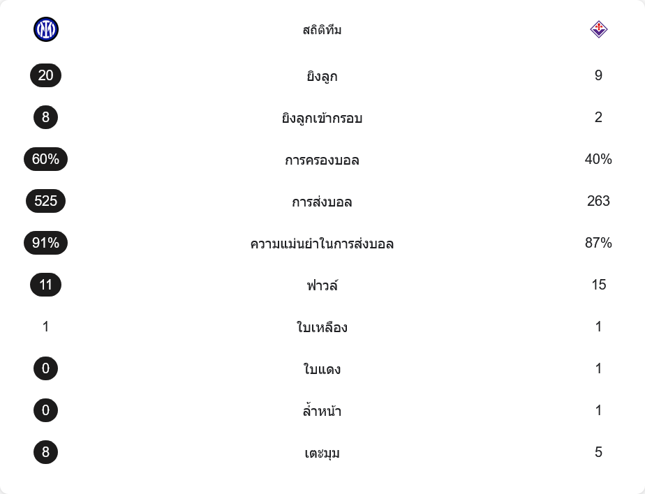 อินเตอร์ภายใต้ระบบ 3-5-2 เน้นการขึ้นเกมจากแดนกลางด้วยความแม่นยำสูง โดยมี คัลฮาโนกลู เป็นเพลย์เมกเกอร์คุมจังหวะเกมอย่างสมบูรณ์แบบ การประสานงานระหว่าง บาเรลล่า และ ซูชิช ทำให้แดนกลางของ “งูใหญ่” ครองบอลได้ถึง 60% และสร้างโอกาสยิงมากถึง 20 ครั้ง ในขณะที่แนวรับของฟิออเรนติน่าในระบบ 3-5-1-1 มีปัญหาในการรับมือการสอดขึ้นของวิงแบ็กทั้งสองฝั่ง โดยเฉพาะจังหวะของ ดิมาร์โก ที่เติมเกมรุกได้ตลอดทั้งแมตช์ การวิเคราะห์บอลเกมนี้ชี้ชัดว่าอินเตอร์เหนือกว่าทุกมิติ ทั้งการครองบอล การส่งต่อ และการเปลี่ยนจังหวะเข้าทำที่เฉียบขาดกว่าอย่างชัดเจน