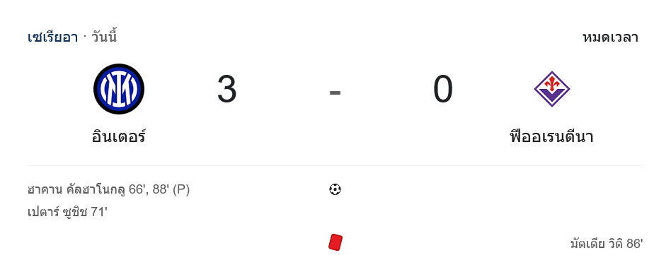 ศึกฟุตบอล กัลโช่ เซเรียอา อิตาลี เกมสุดเดือดที่สนามซาน ซิโร่ “อินเตอร์ มิลาน” เปิดบ้านรับการมาเยือนของ “ฟิออเรนติน่า” และผลการแข่งขันในคืนนี้ บ้านกีฬา เกาะติด ผลบอลสด รายงานครบทุกจังหวะ ก่อนจบเกมด้วยชัยชนะของเจ้าถิ่นแบบขาดลอย 3-0 โดยได้สองประตูจาก ฮาคาน คัลฮาโนกลู และอีกหนึ่งลูกจาก เปตาร์ ซูชิช ส่ง “งูใหญ่” ขยับขึ้นรั้งอันดับ 3 มีแต้มเท่ามิลาน ไล่บี้จ่าฝูงนาโปลีเหลือเพียง 3 คะแนน