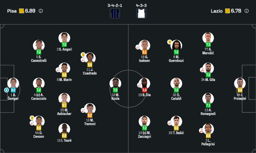 เกมนี้ทั้งสองทีมโชว์แท็กติกในแบบของตัวเองอย่างชัดเจน ฝั่ง ปิซ่า ภายใต้ระบบ 3-4-2-1 เน้นตั้งรับแน่นและรอสวนกลับ ใช้สปีดของเอ็นโซล่ากับกัวดราโด้เปิดเกมสวน โดยมีมารินคุมจังหวะตรงกลาง ส่วน ลาซิโอ้ เล่นตามสูตร 4-3-3 สไตล์ “ซาร์รี่บอล” ที่เน้นการครองบอลสูง ครอสเข้ากรอบและคุมเกมกลางสนามด้วยจังหวะสั้น