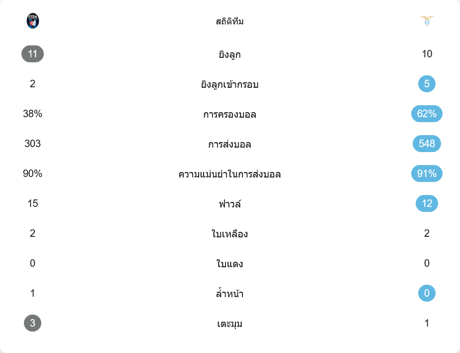 ลาซิโอ้ครองบอลได้ถึง 62% เหนือกว่าชัดเจนเมื่อเทียบกับ 38% ของปิซ่า รวมถึงการส่งบอลมากถึง 548 ครั้งต่อ 303 ครั้ง และมีความแม่นยำ 91% เทียบกับ 90% ของเจ้าบ้าน แต่จังหวะจบสกอร์กลับสูสี ปิซ่ายิง 11 ครั้ง เข้ากรอบ 2 ส่วนลาซิโอ้ยิง 10 ครั้ง เข้ากรอบ 5 ทั้งสองทีมมีใบเหลืองฝั่งละ 2 ฟาวล์ใกล้เคียงกัน 15 ต่อ 12 แต่ปิซ่าดูดุดันกว่าในเกมสวนกลับจนแฟนบอลต้องลุ้นทุกนาที