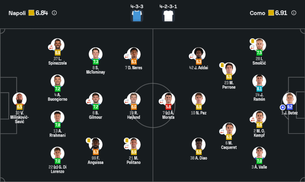 - กองหลัง: โจวานนี่ ดิ ลอเรนโซ่ (7.0), อาเมียร์ ราห์มานี (7.8), อเลสซิโอ บัวนญอร์โน่ (7.2), ลีโอนาร์โด้ สปินัซโซล่า (6.9)