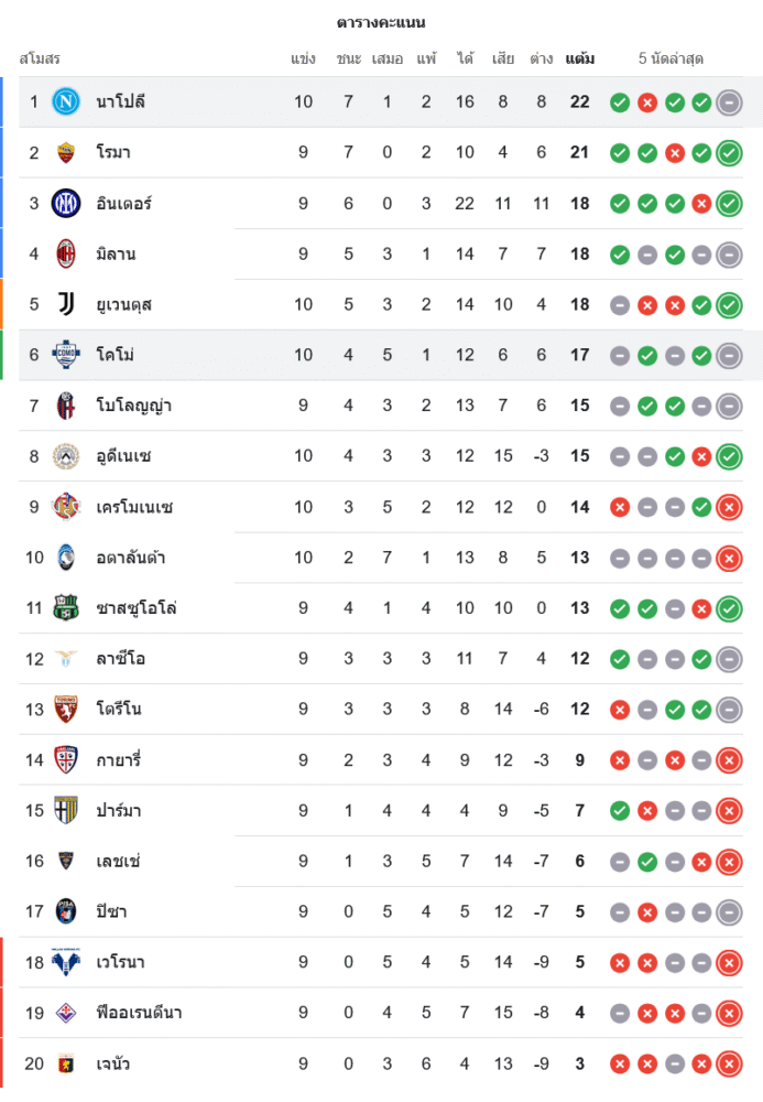 หลังเกมนี้ นาโปลี เก็บเพิ่ม 1 แต้ม รวมเป็น 22 คะแนนจาก 10 นัด ยังนำเป็นจ่าฝูงของ บ้านผลบอล เซเรียอา ต่อเนื่อง ส่วน โคโม ขยับขึ้นมาที่อันดับ 6 มี 17 แต้มจาก 10 นัด ถือเป็นผลงานสุดเซอร์ไพรส์ของทีมน้องใหม่ที่เริ่มต้นฤดูกาลได้ยอดเยี่ยม