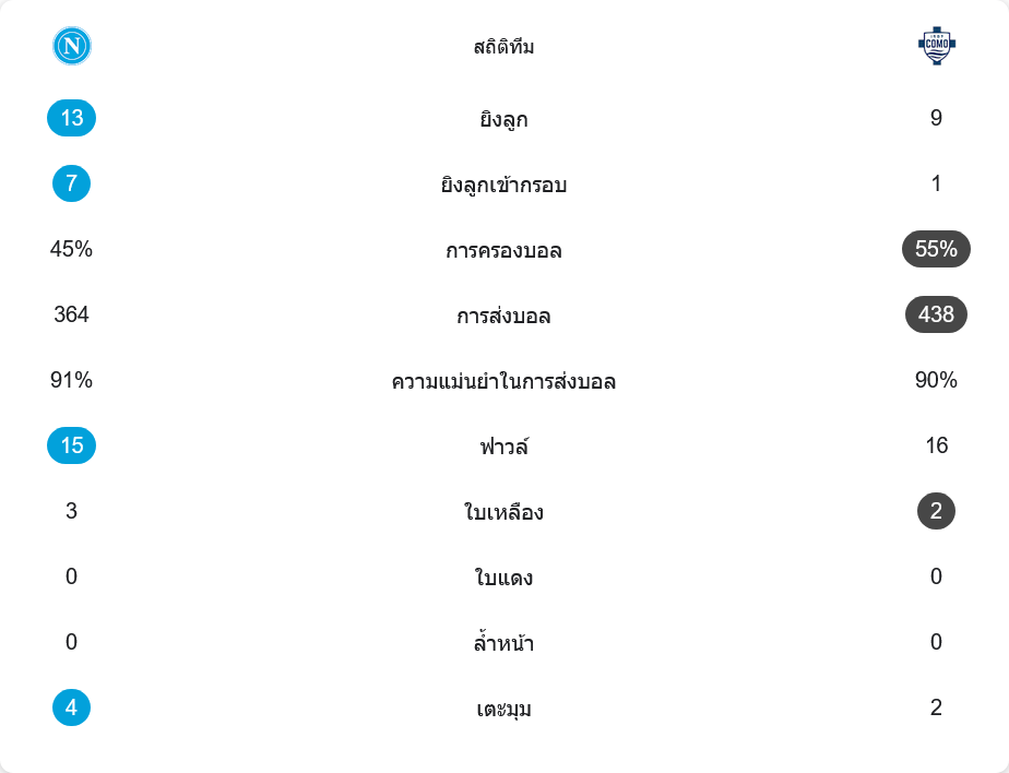 ฝั่งโคโมเองก็มีจังหวะสวนกลับสวยๆ จาก นิโคลัส ปาซ และ มักซิม คาเกอเรต์ แต่ก็ยังขาดความคมในจังหวะสุดท้าย จบครึ่งแรกยังคงเสมอ 0-0 แม้โอกาสยิงของนาโปลีจะมากกว่าเกือบเท่าตัว