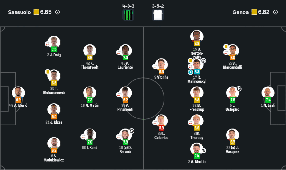 ฝั่ง เจนัว ของโรแบร์โต้ มูร์กิต้า เลือกใช้ 3-5-2 ที่ยืดหยุ่นเป็น 3-4-1-2 เวลาได้บอล โดยให้มาลินอฟสกี้ยืนฟรีโรลล์หลังคู่กองหน้า ขณะที่วิงแบ็กอย่างนอร์ตัน-คัฟฟี่กับมาร์ตินคอยเติมสูงสร้างความกดดันแนวรับเจ้าบ้าน เกมรับเป็นแบบบล็อกกลางแน่นๆ ปล่อยให้ซัสซูโอโล่ครองบอล แต่รอจังหวะตัดแล้วสวนกลับเร็ว ตัวเลขการผ่านบอลอาจน้อยแค่ 236 ครั้ง แต่ทุกครั้งที่ตัดบอลได้ เจนัวพยายามเล่นบอลทะลุช่องทันที นั่นคือเหตุผลที่พวกเขายิงได้ถึง 15 ครั้งเท่ากับเจ้าถิ่น แม้จะครองบอลแค่ 39%