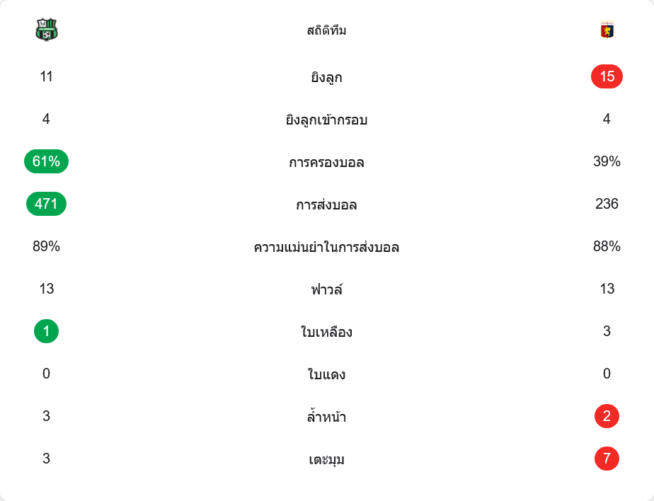 ตัวเลขหลังเกมสะท้อนภาพรวมได้ชัด ซัสซูโอโล่ครองบอล 61% จ่ายบอลมากถึง 471 ครั้ง ความแม่นยำ 89% แสดงให้เห็นว่าเดินเกมบนพื้นได้เนียนตา ขณะที่เจนัวครองบอล 39% จ่าย 236 ครั้ง ความแม่นยำ 88% แม้จะครองบอลน้อยแต่ไม่ได้แปลว่าเล่นพลาดบ่อย ยิงรวม 15 ครั้งเท่ากับเกมสวนกลับที่เข้มข้นพอสมควร