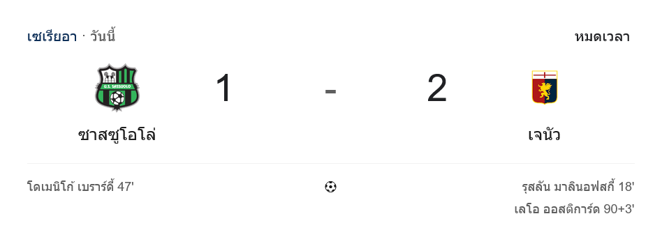 เกมทำท่าจะจบด้วยผลแบ่งแต้ม แต่ดราม่ามาแตกในช่วงทดเจ็บ เจนัวได้เตะมุมทางซ้าย บอลเปิดโค้งไปเสาไกลและเป็น เลโอ โอสต์การ์ด ที่เทกตัวโขกเต็มๆ นาที 90+3 ส่งบอลตุงตาข่าย กลายเป็นประตูชัย 2-1 ให้ทีมเยือนบุกคว้าชัยแบบบีบหัวใจแฟนเจ้าบ้าน จบเกม บ้านผลบอล ยืนยันผลสุดช็อก ซัสซูโอโล่ 1-2 เจนัว