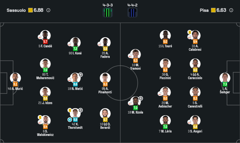 ฝั่งปิซ่าของ Alberto Gilardino เลือกยืน 4-4-2 เล่นเกมรับลึกกลางสนามสองชั้น เน้นปิดพื้นที่หน้ากรอบพร้อมรอจังหวะสวนกลับด้วยสปีดของ เลริส และ เอ็นโซล่า แม้จะมีโอกาสยิงแค่ 8 ครั้ง แต่ทุกครั้งคือการโจมตีที่คมและมีเป้าหมายชัดเจน การเปลี่ยน เมสเตอร์ กับ โมเรอ ลงมาช่วงครึ่งหลังยิ่งทำให้การโต้กลับมีพิษมากขึ้น ทว่าเมื่อถอยไปตั้งโซนรับลึกเกินในช่วงท้าย ก็เปิดโอกาสให้ซัสซูโอโล่บุกกดดันจนมาโดนลูกยิงไกลของธอร์สตเวดต์ในช่วงทดเจ็บอยู่ดี