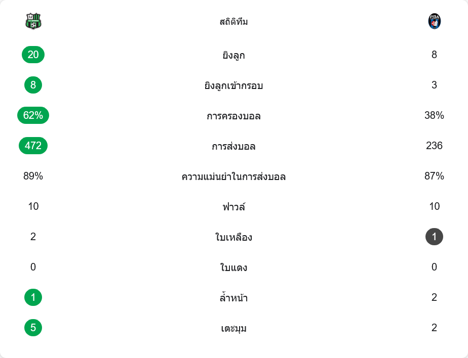 เมื่อมองจากตัวเลข ซัสซูโอโล่เหนือกว่าทุกมิติ พวกเขายิงรวมถึง 20 ครั้ง เข้ากรอบ 8 ครั้ง ครองบอล 62% จ่ายบอล 472 ครั้ง ความแม่นยำสูงถึง 89% ส่วนปิซ่ายิง 8 ครั้ง เข้ากรอบ 3 ครั้ง ครองบอลเพียง 38% และจ่ายบอล 236 ครั้ง ความแม่นยำ 87% ตัวเลขฟาวล์เท่ากันที่ 10 ครั้ง ใบเหลืองซัสซูโอโล่ 2 ใบ ขณะที่ปิซ่าโดน 1 ใบ ล้ำหน้า ซัสซูโอโล่ 1 ครั้ง ปิซ่า 2 ครั้ง และลูกเตะมุมเป็นเจ้าถิ่น 5-2 แสดงให้เห็นชัดว่าเกมนี้เจ้าบ้านบุกอยู่ข้างเดียว แต่ปิซ่ารอจังหวะสวนกลับอย่างมีคุณภาพ