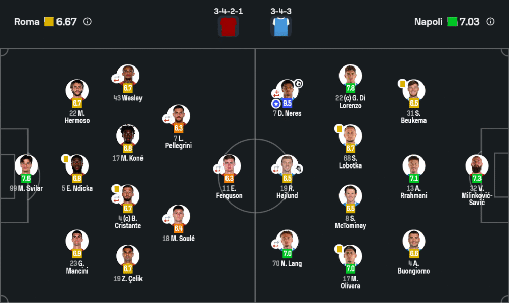 - 🔁 นาที 80 – โรม่าส่ง ลีออน เบลีย์ แทน เปลเลกรินี่ พร้อมกับนาโปลีส่ง เอลิฟ เอลมาส ลงแทน ฮอยลุนด์