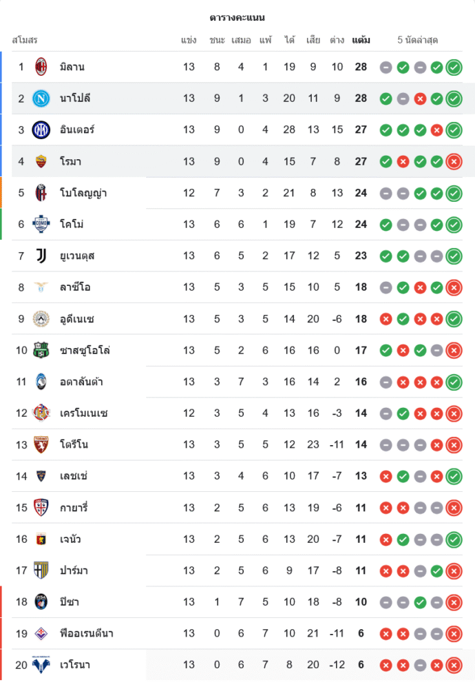 ส่วนโรม่าแม้จะแพ้แต่ยังคงรั้งอันดับ 4 มี 27 คะแนน จากผลงานชนะ 9 แพ้ 4 ยังอยู่ในโซนลุ้นพื้นที่ยุโรป แต่ความพ่ายแพ้คาบ้านเกมนี้คือสัญญาณเตือนว่าหากหลุดอีกเพียงนัดเดียว มีสิทธิ์โดนกลุ่มไล่ล่าจากด้านหลังอย่าง โบโลญญ่า กับ โคโม่ ที่ตามมา 24 คะแนน จี้เข้ามาแบบได้ลุ้นเช่นกัน