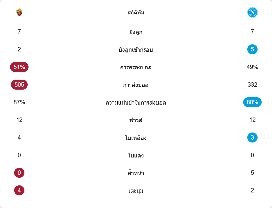 แม้สกอร์จะออกมาบางเฉียบ แต่ตัวเลขในสนามบอกชัดว่านี่คือเกมที่สูสี โรม่าและนาโปลียิงรวมฝ่ายละ 7 ครั้งเท่ากัน ทว่าแข้งทีมเยือนยิงเข้ากรอบถึง 5 ครั้ง ในขณะที่โรม่าได้ลุ้นตรงกรอบเพียง 2 หน บอลจึงอันตรายไม่พอจะทำแผลแนวรับนาโปลี
