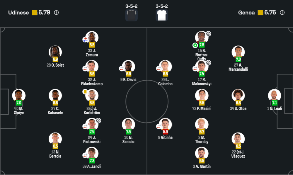 ฟูลแบ็กดาวรุ่งของเจนัวโชว์ฟอร์มสมราคาได้คะแนนสูงสุด 7.5 จากการขึ้นลงไม่มีหมดทั้งเกม นอร์ตัน-คัฟฟี รับบทวิงแบ็กขวาที่ทั้งป้องกันและเติมเกมรุกแบบไม่รู้จักคำว่าเกรงใจเจ้าบ้าน ในเกมรับเขาช่วยปิดพื้นที่ของเซมูร่าและโมเดสโต้ได้ดี ส่วนในเกมรุกมีทั้งจังหวะเลี้ยงกินตัว, ตัดเข้าในยิงเอง รวมถึงการเปิดบอลที่แม่นยำหลายครั้ง ไฮไลต์คือจังหวะโยนให้เอกูบันโฉบยิงประตูชัย นาที 83 ที่ทำให้สามคะแนนหลุดจากมืออูดิเนเซ่โดยตรง ผนวกกับผลงานของ มาลินอฟสกี และ เลอาลี ที่โดดเด่นไม่แพ้กัน ทำให้ไลน์ขวาของเจนัววันนี้กลายเป็นฝันร้ายของแนวรับเจ้าบ้านอย่างแท้จริง