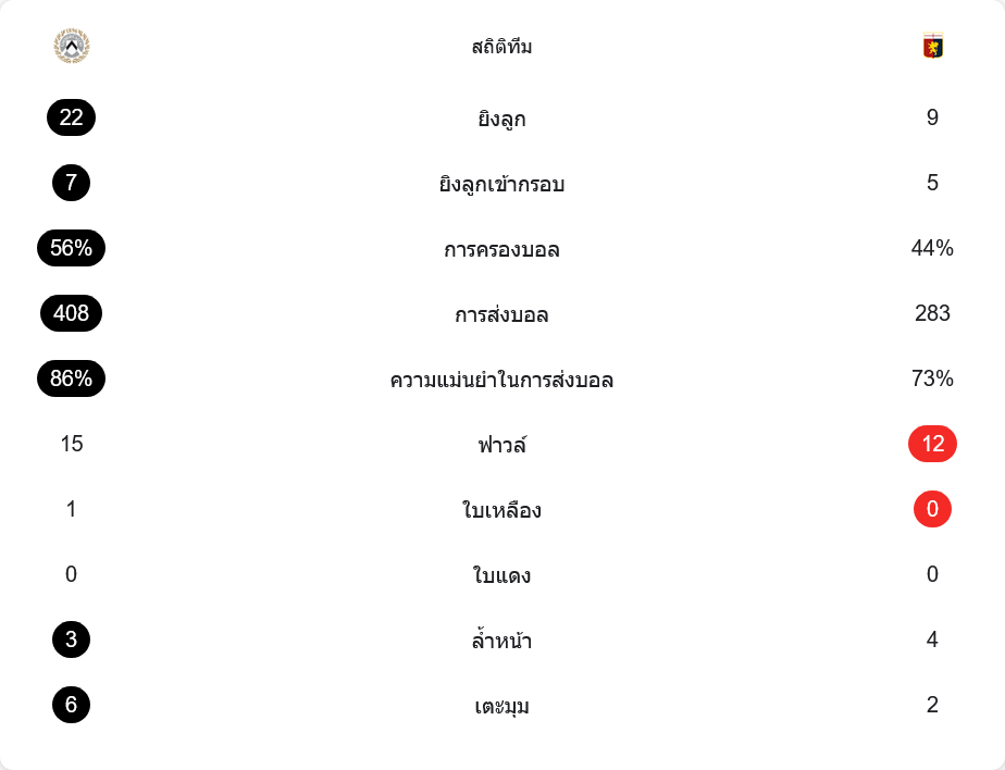 ตัวเลขหลังเกมชี้ชัดว่าอูดิเนเซ่ไม่ได้แพ้เพราะรูปเกมแต่แพ้เพราะความคม เจ้าถิ่นยิงรวมถึง 22 ครั้ง เข้ากรอบ 7 ครั้ง ครองบอล 56% ต่อ 44% ในขณะที่เจนัวยิงเพียง 9 ครั้ง เข้ากรอบ 5 ครั้ง แต่เปลี่ยนเป็นสองประตูเต็ม ๆ เกมผ่านเท้าผู้เล่นอูดิเนเซ่มากถึง 408 ครั้ง ด้วยความแม่นยำการจ่าย 86% ส่วนเจนัวจ่าย 283 ครั้ง แม่นยำ 73% ฟาวล์ใกล้เคียงกัน 15 ต่อ 12 ใบเหลืองมีเพียง ยาค็อบ คาร์ลส์ตรอม ที่โดนจดชื่อให้ฝั่งเจ้าบ้าน ล้ำหน้ากันคนละหลายหน (อูดิเนเซ่ 3 ครั้ง เจนัว 4 ครั้ง) ลูกเตะมุมเจ้าถิ่นได้มากกว่า 6 ต่อ 2 แต่ก็ไม่สามารถเปลี่ยนเป็นสกอร์เพิ่มได้