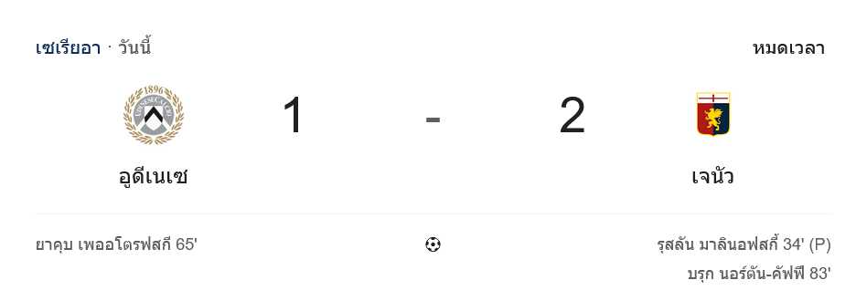 - 🔹 ทดเวลา 90+4: จบเกมที่อูดิเน เจนัวบุกชนะ 2-1 เก็บสามแต้มสำคัญออกจากบ้านเจ้าถิ่น