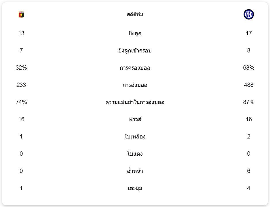- เจนัว: มีการยิงทั้งหมด 13 ครั้ง เข้ากรอบ 7 ครั้ง และครองบอลได้ 32% ด้วยการส่งบอลทั้งหมด 233 ครั้ง ความแม่นยำในการส่งบอลอยู่ที่ 74% พวกเขาทำฟาวล์ทั้งหมด 16 ครั้ง ได้รับใบเหลือง 1 ใบ และไม่มีใบแดง ได้เตะมุม 1 ครั้ง