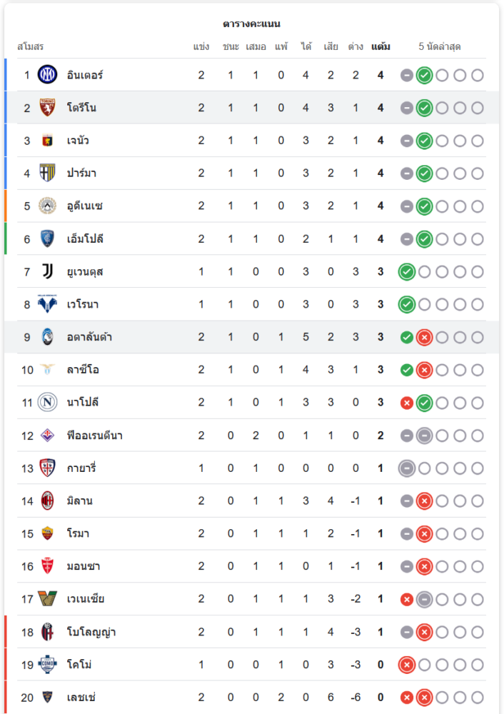 ด้วยผลการแข่งขันนี้ โตริโน่ ขยับขึ้นมาอยู่ในอันดับที่ 2 ของตาราง เซเรียอา โดยมี 4 คะแนนจากการลงเล่น 2 นัด ขณะที่ อตาลันต้า อยู่ในอันดับที่ 9 ของตาราง มี 3 คะแนนจากการลงเล่น 2 นัด