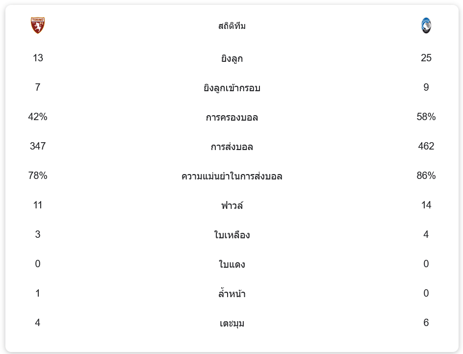 อตาลันต้า ครองบอลได้มากกว่า โดยมีอัตราครองบอลอยู่ที่ 58% เมื่อเทียบกับ โตริโน่ ที่มี 42% โอกาสยิงของ อตาลันต้า มีถึง 25 ครั้ง เข้ากรอบ 9 ครั้ง ขณะที่ โตริโน่ มีโอกาสยิง 13 ครั้ง เข้ากรอบ 7 ครั้ง ในส่วนของการส่งบอล อตาลันต้า มีความแม่นยำสูงถึง 86% จากการส่งบอล 462 ครั้ง ขณะที่ โตริโน่ มีความแม่นยำ 78% จากการส่งบอล 347 ครั้ง เกมนี้มีการทำฟาวล์หลายครั้ง โดย โตริโน่ ทำฟาวล์ 11 ครั้ง ได้รับใบเหลือง 3 ใบ ขณะที่ อตาลันต้า ทำฟาวล์ 14 ครั้ง และได้รับใบเหลือง 4 ใบ