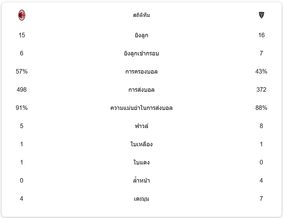 เอซี มิลาน ครองบอลได้ 57% และมีการผ่านบอลที่แม่นยำถึง 91% พวกเขายิงประตูทั้งหมด 15 ครั้ง และเข้ากรอบ 6 ครั้ง ขณะที่ เลชเช่ มีการยิงทั้งหมด 16 ครั้ง เข้ากรอบ 7 ครั้ง แต่กลับไม่สามารถเจาะแนวรับของมิลานได้ ทำให้สุดท้ายพวกเขาต้องพ่ายแพ้ไปอย่างน่าเสียดาย