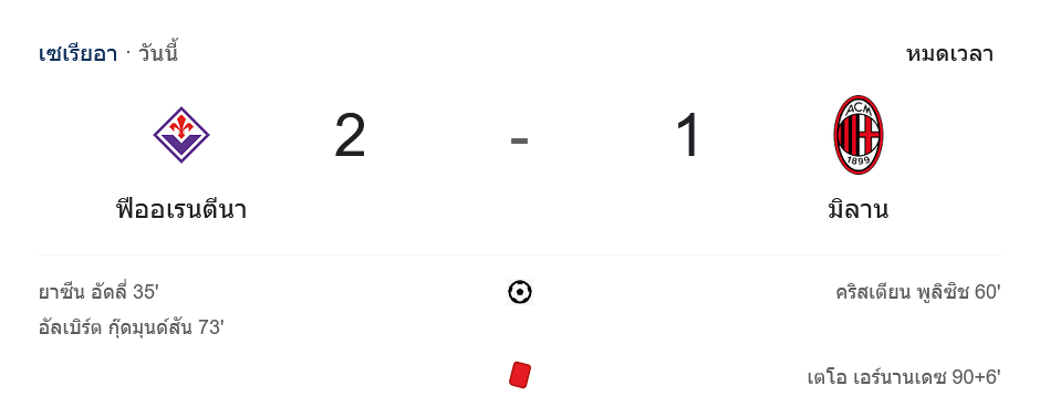 การแข่งขันฟุตบอล เซเรียอา 2024 ฟิออเรนติน่า เปิดบ้านเอาชนะ เอซี มิลาน 2-1 ในเกมสุดตื่นเต้น โดยมิลานพยายามจะเก็บแต้มเพื่อขยับอันดับขึ้น แต่ต้องมาพ่ายให้กับฟิออเรนติน่าที่จัดการยิงสองประตูสำคัญจาก ยาซีน อัดลี่ และ อัลเบิร์ต กุ๊ดมุนด์สัน พร้อมใบแดงดราม่าของ เตโอ เอร์นานเดซ ช่วงท้ายเกม