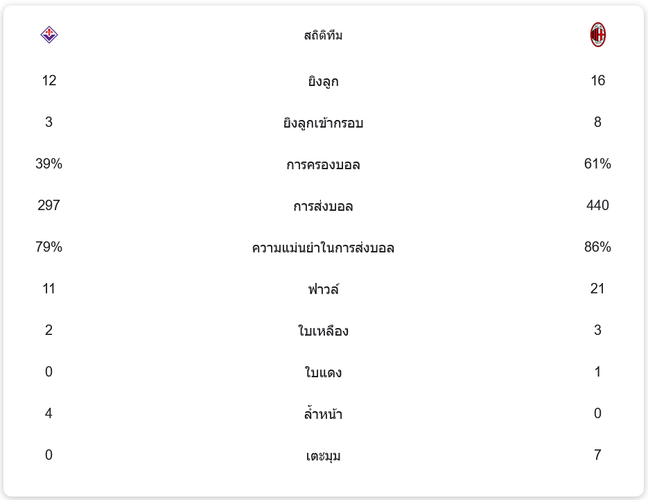 ในเกมนี้ เอซี มิลาน ครองบอลได้มากกว่าถึง 61% และมีโอกาสยิงทั้งหมด 16 ครั้ง แต่ยิงเข้ากรอบเพียง 8 ครั้ง ขณะที่ ฟิออเรนติน่า มีการครองบอลเพียง 39% แต่มีโอกาสยิง 12 ครั้ง เข้ากรอบ 3 ครั้ง ทั้งสองทีมเล่นกันอย่างดุเดือด โดยฟิออเรนติน่ามีการทำฟาวล์ 11 ครั้ง และได้ใบเหลือง 2 ใบ ขณะที่มิลานทำฟาวล์ถึง 21 ครั้ง และได้ใบเหลือง 3 ใบ รวมถึงใบแดง 1 ใบ