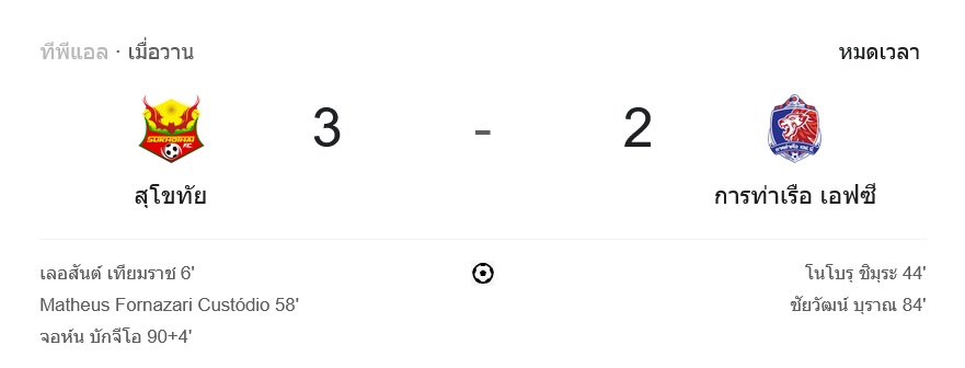 เกมทำท่าจะจบลงด้วยผลเสมอ 2-2 แต่แล้วในช่วงทดเวลาบาดเจ็บนาทีที่ 90+4 จอห์น บักจิโอ สวมบทฮีโร่ซัดประตูชัยจากการจ่ายของ สุรวิช โลกาวิทย์ ส่งให้ สุโขทัย เอฟซี คว้าชัยไปแบบสุดดราม่า 3-2