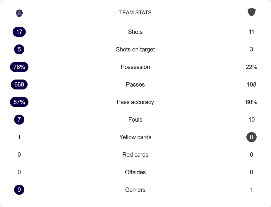 บุรีรัมย์เหนือกว่าชัดเจนด้วยการครองบอลสูงถึง 78% ยิงรวม 17 ครั้ง เข้ากรอบ 5 ครั้ง ขณะที่ ระยอง มีโอกาสยิง 11 ครั้ง เข้ากรอบเพียง 3 ครั้ง การจ่ายบอลบุรีรัมย์ทำได้แม่นยำสูงถึง 87% จากการจ่าย 669 ครั้ง เทียบกับ ระยองที่จ่ายเพียง 198 ครั้ง ความแม่นยำ 60% เท่านั้น