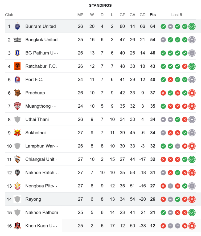 บุรีรัมย์ ยูไนเต็ด รั้งจ่าฝูงเหนียวแน่นด้วย 64 คะแนนจาก 26 นัด ขณะที่ระยอง เอฟซี อยู่อันดับ 14 มี 26 คะแนน ต้องดิ้นรนหนีตกชั้นต่อไป