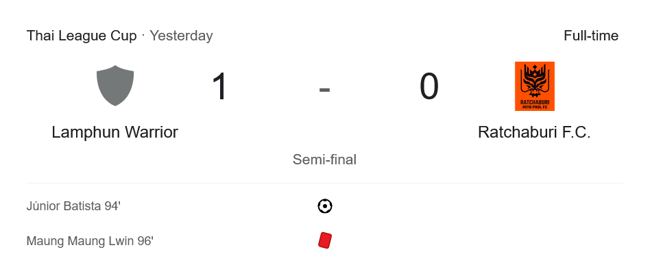 ในช่วงต่อเวลา ลำพูนได้ทีสวนกลับเร็วจากบอลยาวด้านข้าง และเป็น จูเนียร์ บาไตสต้า ที่หลุดเข้าไปซัดเสียบเสาสุดสวยในนาทีที่ 94 พาทีมขึ้นนำ 1-0 จากนั้น ราชบุรีพยายามเร่งเกมสุดชีวิต แต่กลับต้องเจอกับจังหวะหยุดเกมจากฝั่งเจ้าถิ่นหลายครั้ง ก่อนที่ความดุเดือดจะระเบิดในนาทีที่ 96 เมื่อ เมา เมา ลวิน แข้งตัวสำรองของลำพูนโดนใบแดงโดยตรงจากจังหวะปะทะหนัก ทำให้เจ้าบ้านต้องเหลือ 10 คนในช่วงท้ายเกม แต่สุดท้ายก็ยันสกอร์ไว้ได้จนจบการแข่งขัน