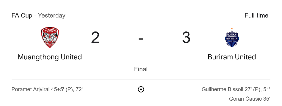 ศึกฟุตบอลช้าง เอฟเอ คัพ 2025 เดินทางถึงรอบสำคัญ และเมื่อค่ำวันที่ 24 พฤษภาคมที่ผ่านมา แฟนบอลทั่วประเทศต่างจับตามองเกมคู่เดือดระหว่าง เมืองทอง ยูไนเต็ด เปิดบ้านรับการมาเยือนของ บุรีรัมย์ ยูไนเต็ด ในบรรยากาศที่ตึงเครียดแต่เร้าใจตั้งแต่นาทีแรก และผล ผลบอลสด ที่ออกมาทำให้สนามแทบแตก เมื่อปราสาทสายฟ้าอาศัยความนิ่งและเฉียบคมเฉือนชนะกิเลนผยองไปได้แบบสุดมันส์ 3-2 แชมป์ฟุตบอลถ้วยสุดยิ่งใหญ่