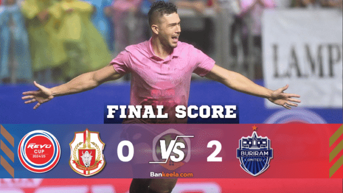 ศึกฟุตบอลถ้วย “รีโว่ คัพ 2024/25” นัดชิงชนะเลิศ เมื่อค่ำวันที่ 31 พฤษภาคม 2568 ที่สนามบีจี สเตเดียม กลายเป็นค่ำคืนแห่งความทรงจำของ “ปราสาทสายฟ้า” บุรีรัมย์ ยูไนเต็ด ที่คว้าแชมป์รายการนี้ได้สำเร็จ ด้วยการเอาชนะ “ราชันโคขาว” ลำพูน วอริเออร์ 2-0 แม้เกมจะเต็มไปด้วยความตึงเครียดและดราม่าตั้งแต่ต้นจนจบ แต่สุดท้ายความเก๋าและความเฉียบขาดของบุรีรัมย์ก็เป็นฝ่ายปิดจ๊อบได้สำเร็จ บ้านกีฬาไม่พลาดอัปเดต ผลบอลสด นาทีต่อนาที พร้อมสรุปทุกจังหวะสำคัญให้แฟนบอลได้ติดตามกันแบบถึงใจ