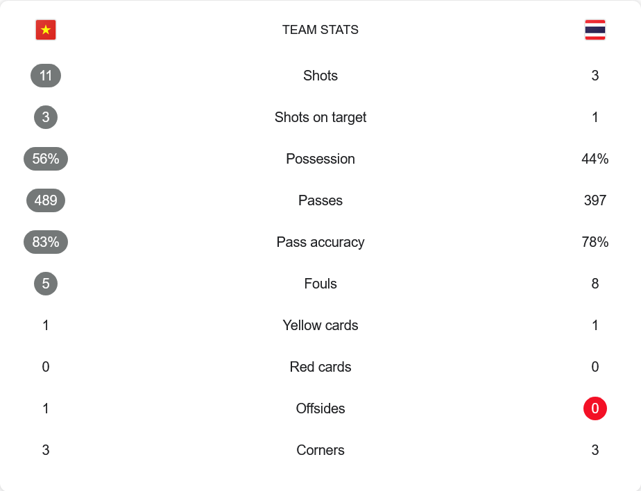 เวียดนามครองบอลมากกว่า 56% ต่อ 44% จ่ายบอลสำเร็จ 83% จาก 489 ครั้ง เทียบกับไทยที่จ่ายบอลสำเร็จ 78% จาก 397 ครั้ง เวียดนามยิงทั้งหมด 11 ครั้ง เข้ากรอบ 3 ครั้ง ส่วนไทยยิงได้เพียง 3 ครั้ง เข้ากรอบ 1 ครั้ง ฟาวล์ใกล้เคียงกัน แต่ไทยเสียฟาวล์มากกว่า (8 ต่อ 5) ลูกเตะมุมเท่ากันที่ 3 ครั้ง และมีใบเหลืองฝั่งละ 1 ใบ