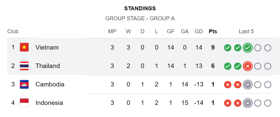 เวียดนามจบอันดับ 1 ของกลุ่ม A ชนะรวด 3 นัด ยิง 14 ประตู ไม่เสียเลย เก็บ 9 คะแนนเต็ม ส่วนไทยแม้จะแพ้ในเกมนี้ แต่ยังเข้ารอบเป็นอันดับ 2 ด้วย 6 คะแนน จากการชนะกัมพูชาและอินโดนีเซีย