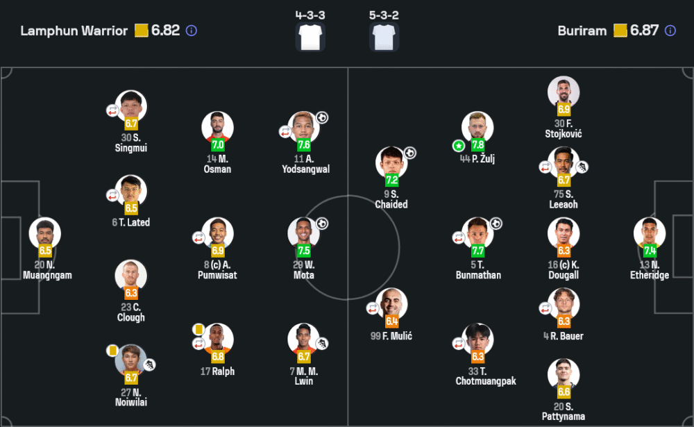 Lamphun Warrior มาในระบบ 4-3-3 เน้นเกมรุกริมเส้นจาก ออสมัน และ ยอดสังวาลย์ ซึ่งทำได้ดีในครึ่งแรก โดยใช้ โมต้า คุมจังหวะในแดนกลางอย่างยอดเยี่ยม ขณะที่เกมรับยังขาดความแน่นอน โดยเฉพาะช่วงหลัง Buriram เปิดเกมรุกใส่ตลอดครึ่งหลัง