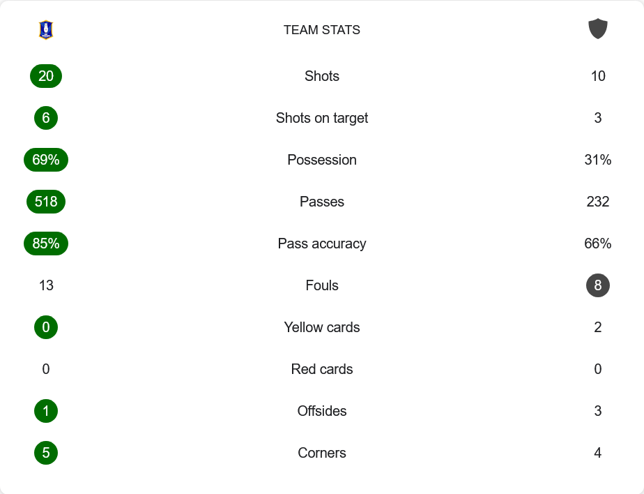 ตัวเลขยืนยันภาพรวม บีจีเหนือกว่าชัด 20 ครั้งต่อการยิงของเจ้าบ้านเทียบกับ 10 ของทีมเยือน เข้ากรอบ 6 ต่อ 3 ครองบอล 69% ต่อ 31% ต่อบอลสำเร็จ 85% มากกว่า 66% ของลำพูน จ่ายบอลรวม 518 ต่อ 232 บีจีได้เตะมุม 5 ครั้ง มากกว่าลำพูนที่ได้ 4 ครั้ง เกมหนักพอสมควร ฟาวล์ 13 ต่อ 8 ใบเหลืองทั้งหมดเป็นของทีมเยือน 2 ใบ ขณะที่ล้ำหน้า ลำพูนโดนไป 3 ครั้ง บีจี 1 ครั้ง ตัวเลขทั้งหมดสะท้อนความต่อเนื่องและความคมในช่วงท้ายของเจ้าถิ่น
