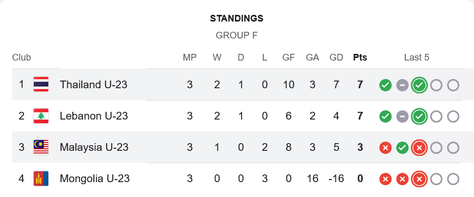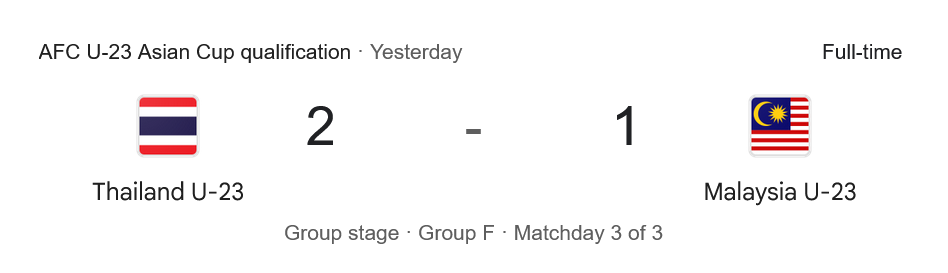 สามแต้มเกมนี้ส่งไทย U23 จบแชมป์กลุ่ม F มี 7 คะแนน เท่ากับเลบานอน แต่ได้เปรียบผลต่างประตูได้เสีย (ไทย +7, เลบานอน +4) เข้ารอบสุดท้ายเอเชียนคัพ U23 ซาอุฯ 2026 อัตโนมัติ ส่วนมาเลเซียมี 3 คะแนน จบอันดับ 3 ของกลุ่ม