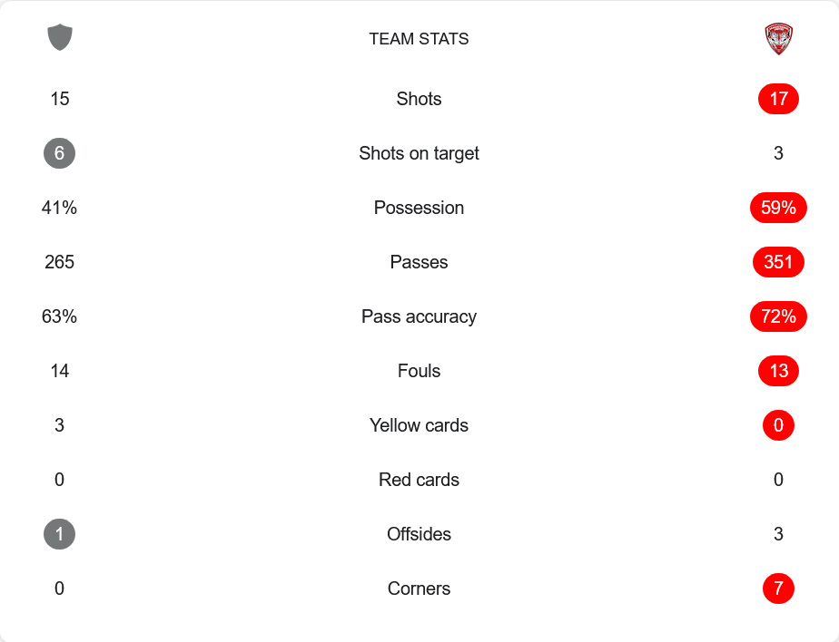 ตัวเลขชี้ชัดว่า เมืองทอง ยูไนเต็ด ครองบอลเหนือกว่า 59% ต่อ 41% และมีโอกาสยิงรวม 17 ครั้ง ขณะที่ระยองยิง 15 ครั้ง แต่สิ่งสำคัญคือเจ้าบ้านได้ยิงตรงกรอบถึง 6 ครั้งและเปลี่ยนเป็น 2 ประตูเต็ม ๆ ขณะที่เมืองทองยิงตรงกรอบเพียง 3 ครั้ง นอกจากนี้ เมืองทองได้ลูกเตะมุมถึง 7 ครั้ง แต่ไร้ผลเป็นประตู เกมนี้สะท้อนความแตกต่างระหว่าง “การครองบอล” และ “ความเฉียบคมในการจบสกอร์”