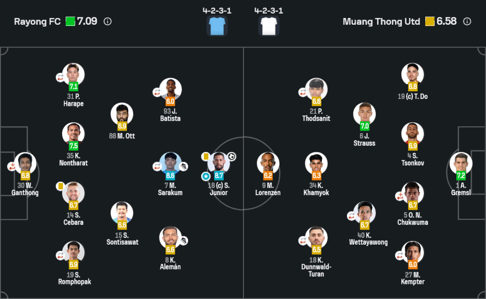 สเตนิโอ จูเนียร์ คือตัวละครเอกของค่ำคืนนี้ ยิง 1 จ่าย 1 และคอยปั่นป่วนแนวรับเมืองทองทั้งเกม ได้คะแนนสูงสุด 8.7 พร้อมปลุกขวัญกำลังใจให้เพื่อนร่วมทีมระยองอย่างเต็มเปี่ยม